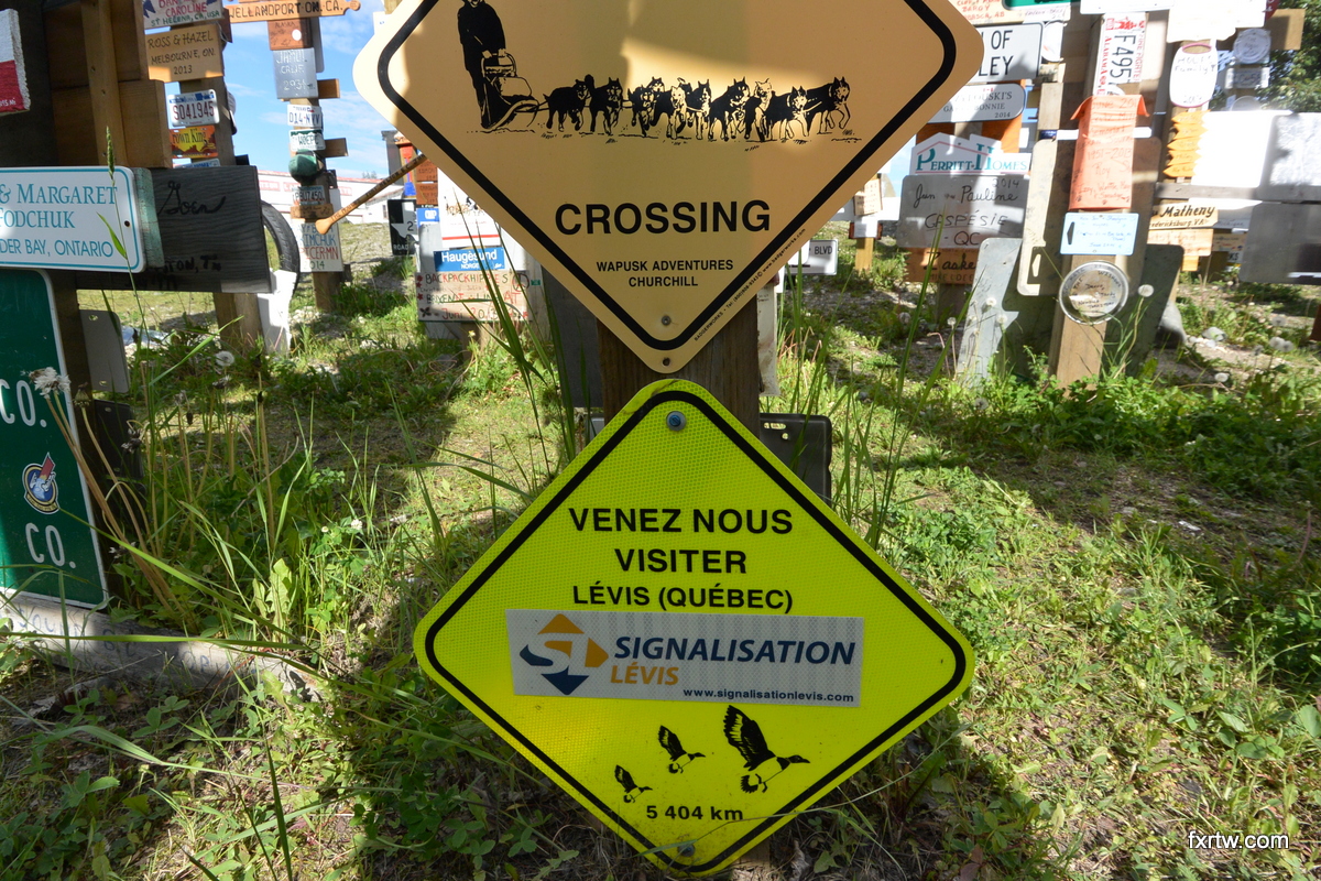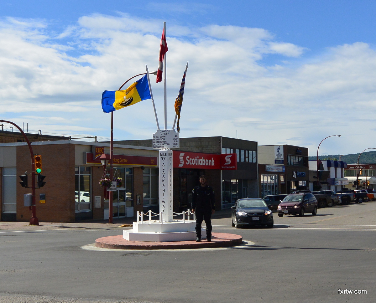P-A and Michelle had to leave for work by 7h30, so we had all our stuff ready at night. They both signed the map and we took a few pictures before leaving. I really enjoyed my stay there: thanks guys! The ride up to Dawson Creek was not very interesting… Other than a chilling moose on the side of the road. We arrived in Dawson Creek around dinner time and we met more other motorcycle travelers there in 5 minutes than we did for the past 2 weeks. This town is home of the beginning of Alaska Highway up to Fairbanks. There are not several route options to go up there I guess…
