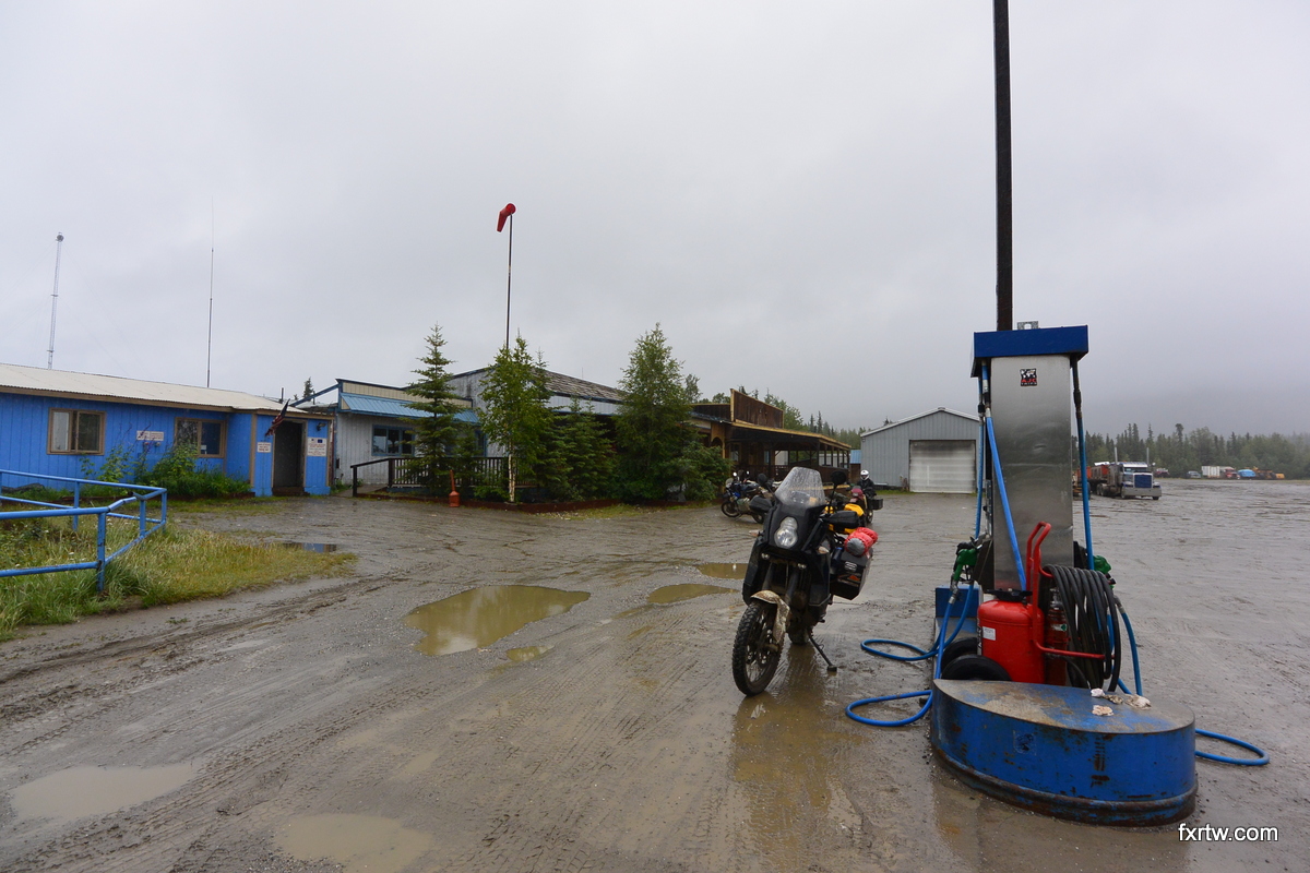 John heard about the Denali Highway and wanted to hit it before going down to Anchorage. We left after eating some free hot dogs at the local motorcycle shop. Sun has been shining all day when we hit the Denali. There, it was pouring down and we grabbed some gas before reaching a campground to pitch our tents. We cooked some canned food and Kraft Dinner under that pouring rain. It rained so much that we would have to empty our plates from rain water a couple times while eating. We set up a tarp between the 3 bikes for John as his tent was leaking and then I went to sleep.