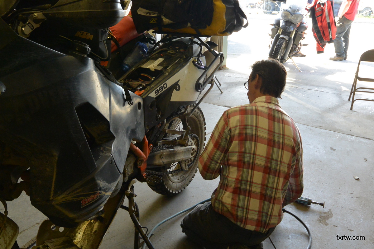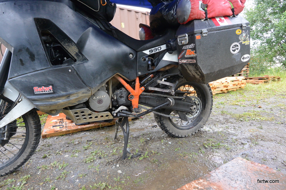 I had an appointment at 10am at The Motorcycle Shop in Anchorage and was 2h away. I unfortunately was 45min late, but they did not mind it much. We agreed that they would do the seals and help me with a few things such as an oil pan and a 32mm wrench for my front sprocket. It was raining out and one of the KTM tech (Chris) very kindly offered to lend me his bike tent for the day (thanks man!). It was much better than the tarp I wanted to set up. I started by taking the fork out. Then I did my oil change and they helped me clean my filters. I then replaced my sprockets and chain before putting the fork back in. When all done, I was trying to pack the tent back in the bags when an older man came up to me in his shirt under the rain and offered to help. We folded the top part before he told me he was the owner of the shop. You don’t see that happening every day! I paid for service (Kenny was very reasonable) and headed to a cheap hotel for the night. I was totally soaked and needed to dry everything. There, I did laundry and spread everything on the floor. Then I went out and had a great time with Reese at a local bar with a live band and went to sleep around 3am.