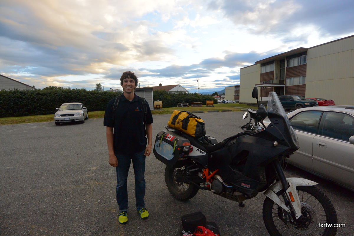 Olivier had to leave early for work and I left at the same time as him. He signed the map and I thanked him for all he did before he took off. When starting the bike, I realized my main switch for all accessories and lights was gone. I was getting upset with those low quality switches. I shorted the contact to get the lights back (they are somewhat important) and left Kitimat around 8am. It was getting cloudy out and I wanted to get going before it rained on me. I did 200km before stopping for a nap. Then I would take another map every other 100km… I did not sleep much the past 2 days as I was not used to get up early. I arrived in Prince George around 5pm and had dinner. I rode for another 100km before setting camp in a Provincial Park close to Quesnel. There, I swam in the lake to wash some of the sweat from the hot day. I then met a really cool couple that were from Vancouver Island. They were both on adventure bikes as well and were coming back from doing the Dempster highway up to Inuvik. They offered me a beer and we chatted for most of the evening. They advised me to respect speed limits in US federal parks as they had a very bad experience. They also told me to go to Tofino and how to get back to Victoria on the back roads. I had had a big day and went to sleep around 11pm.
