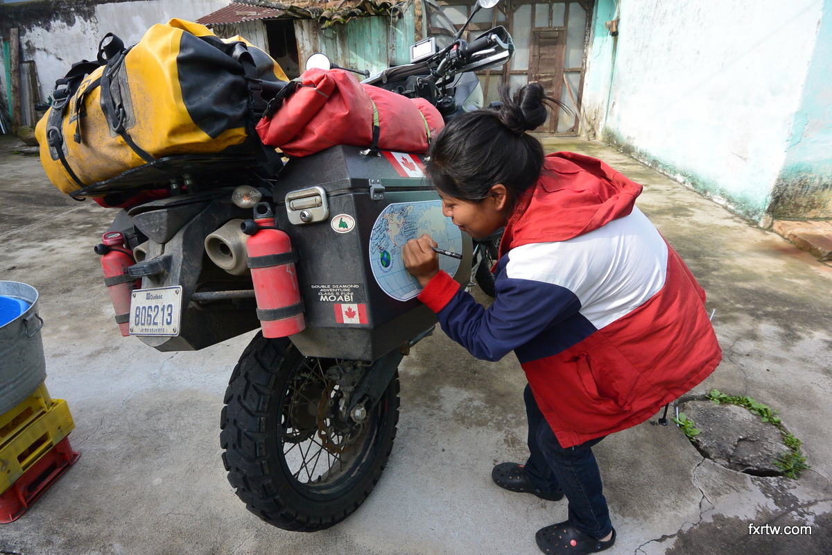 I was up at 4am the next morning. Not that I wanted to, but I couldn’t go back to sleep. I read for an hour and then got my stuff ready before breakfast. Earlier that week, I was very surprised to find a can of Quebec maple syrup laying on a shelf in the kitchen. They explained that a lady from Quebec stayed with them a few months earlier and gave it to them. They did not know what to do with it and I promised to show them next time I ate pancakes. So I hate lots of pancakes with maple syrup from Quebec for my last breakfast. I signed their guestbook with a page long note and then Mayra signed my map for the family. Before I left, I thanked them for everything and Mayra gave me a little gift package in which she had put a few candy and a very thoughtful note. I left my house in Xela around 8am. I then stopped at the school to see if Fernando was there. He was and I asked him if he wanted to sign the map. He did, and off I was towards Lake Atitlan.