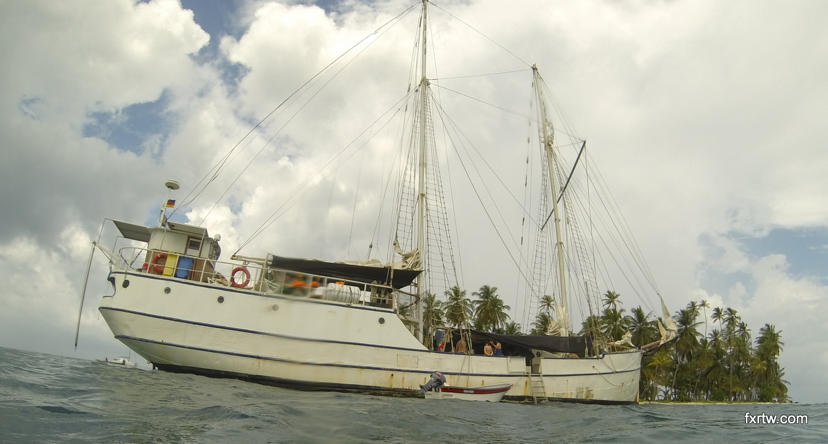 I was ready to go by 9.30am. The road to the port in Carti took me 2h. It got very twisty and nice in the last 50km. I arrived at the port facing the ocean and could see the Stahlratte out far. It turned out that I was not in the right side of the port. I rode on a small path and almost ran into a small restaurant by crossing a creek on a 2×6. I parked the bike on the dock next to another. Then Joe and Tom arrived together. Miguel came to get us with a smaller boat. We took all our luggage off the bikes and boarded the boat towards the Stahlratte. There, we installed our stuff on our bunk bed and grabbed a beer to chill out on the top deck. We met with captain Ludwig, and the two other crew members, Olivia and Sacha. The crew had cooked a delicious lunch and we started eating when Joel and Ryan showed up on the dock. Soon they were eating with us. The Stahlratte was very impressive. It was built in 1903 and was still in great condition. The reinforcement brackets were obviously cut with a torch and nothing was symmetric on that ship. Nevertheless, it is still up and floating after more than 110 years of abuse.